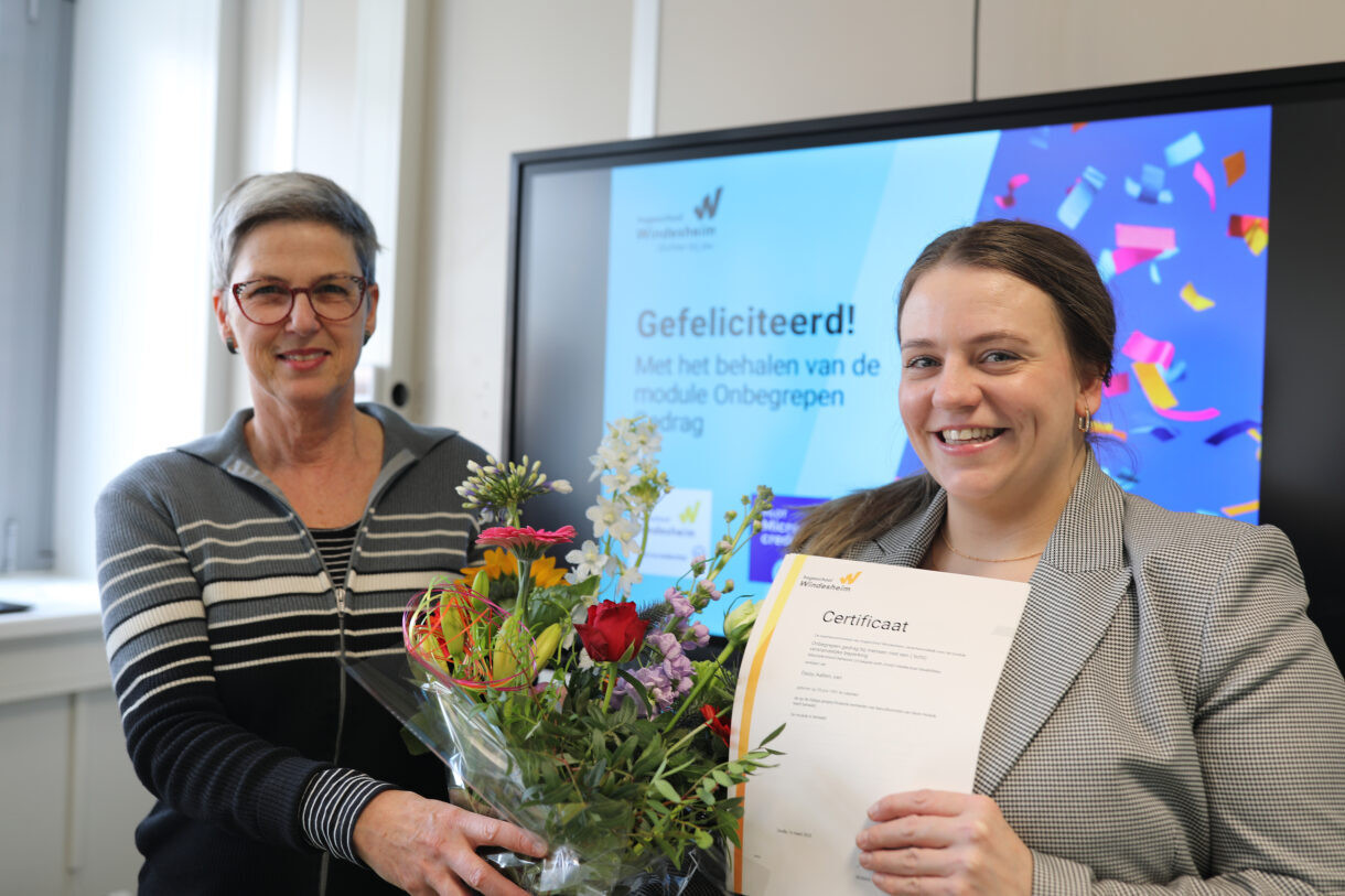 Daisy is werkzaam als woonbegeleider bij Stichting Philadelphia Zorg. Vanuit interesse en de behoefte om zich nog beter te kunnen inleven in de mensen waarmee ze werkt, volgde zij de module Onbegrepen Gedrag bij Windesheim. Dat ze na de succesvolle voltooiing (uitmuntend!) ook een microcredential mocht ontvangen was voor haar een verrassing. Ze kreeg deze op donderdag 16 maart digitaal uitgereikt uit handen van directeur Gezondheid en Welzijn Victorine de Graaf-Peters van Windesheim. Met dit certificaat in handen, heeft de door haar gevolgde module voor Daisy nog meer betekenis gekregen. Ze wil zich in de toekomst verder op hbo-niveau in haar vakgebied bekwamen en de behaalde microcredential is daarin voor haar een betekenisvol puzzelstukje.